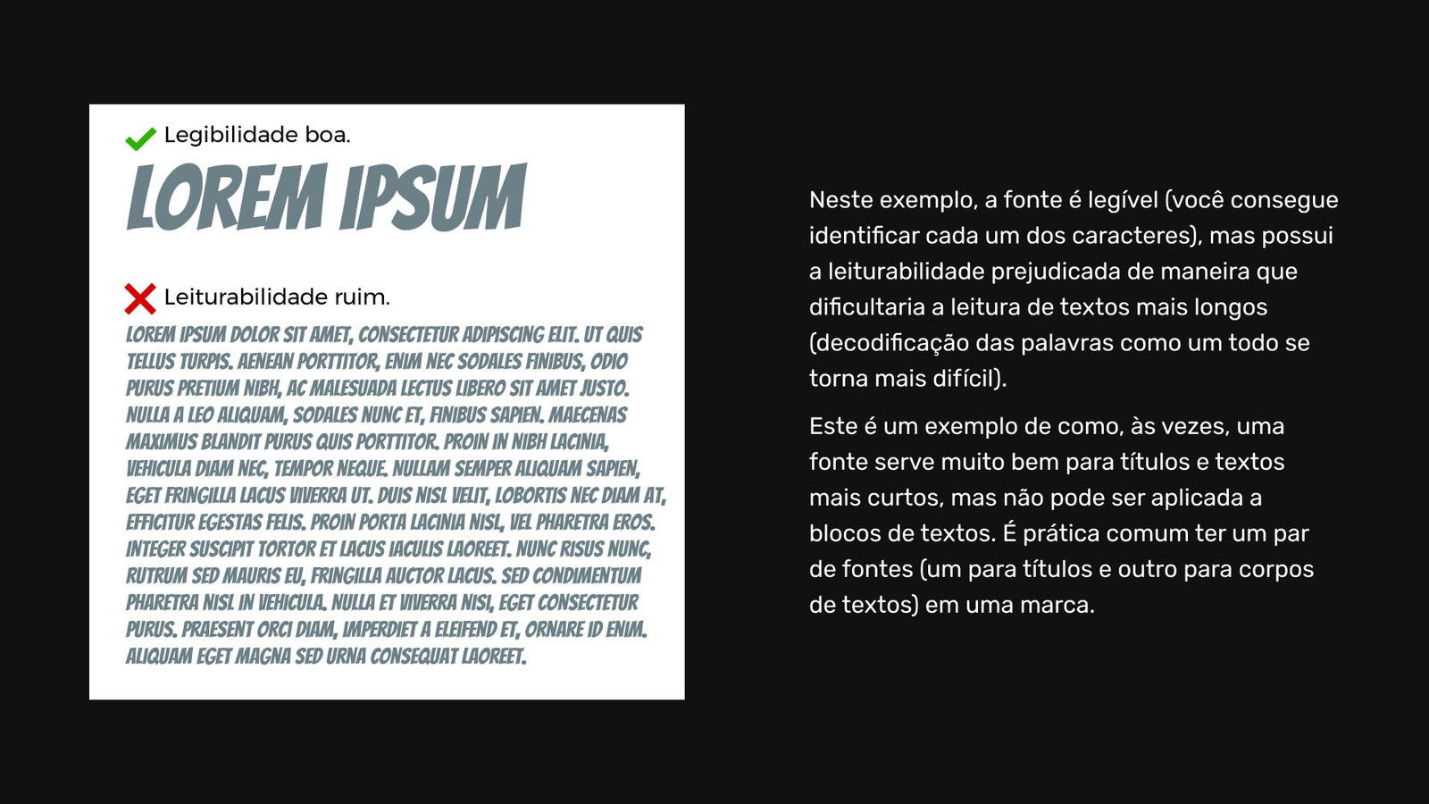 Aplicação: No projeto, ressaltamos que uma fonte pode ser ótima para títulos por ser legível, mas péssima para o corpo do texto por prejudicar a leiturabilidade em textos longos. Além disso, evitamos o uso excessivo de caixa alta (ALL CAPS) em parágrafos, pois as hastes das letras minúsculas facilitam o reconhecimento das palavras pelo cérebro, tornando a leitura menos cansativa.