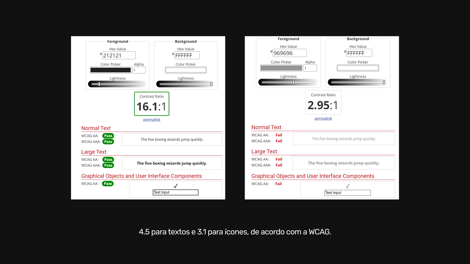- Contraste: Seguimos as recomendações da WCAG 2.0, garantindo um contraste mínimo de 4.5:1 para textos e 3.1:1 para ícones auxiliares.