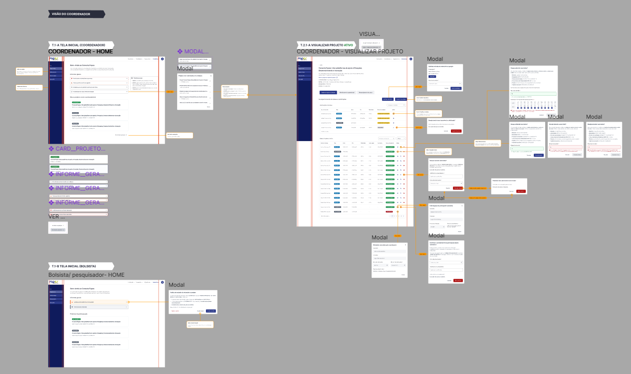 Dentro do time de design, meu papel é organizar e gerenciar a criação do Design System, garantindo que o trabalho de todos siga uma mesma linha lógica e visual em todos os módulos do Conecta Fapes.